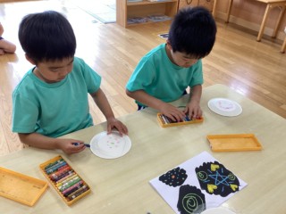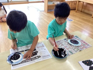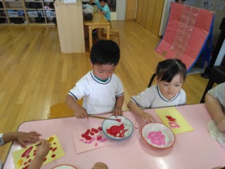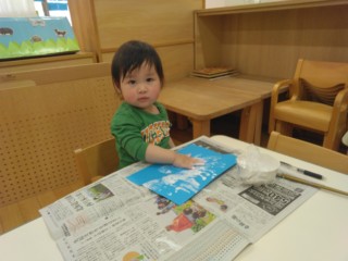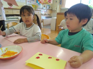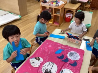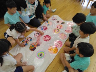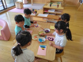 デカルコマニー(絵の具を塗りつけた紙を半分に折り、しっかりと押さえてからひろげる)の技法で、こいのぼりのうろこ1枚1枚を丁寧に仕上げました!カラフルな模様が出来上がると嬉しそうに見入っていました。