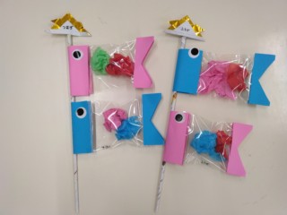 グループカラーのピンクを意識して、ピンク色のカラーポリ袋で作りました!画用紙を好きな形に切って、うろこやひげも作りました。『子どもの日の集い』の行事の時にみんなにお披露目をして、はいポーズ✌