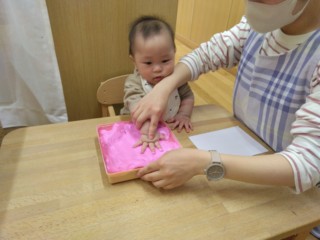 保育園で初めての手形、足型に挑戦!「何だ~、これは⁉」といった感じで、目をまんまるにしながら取り組みました。安心できる保育者と一緒なら、楽しくできるね♡かわいい写真付きです。